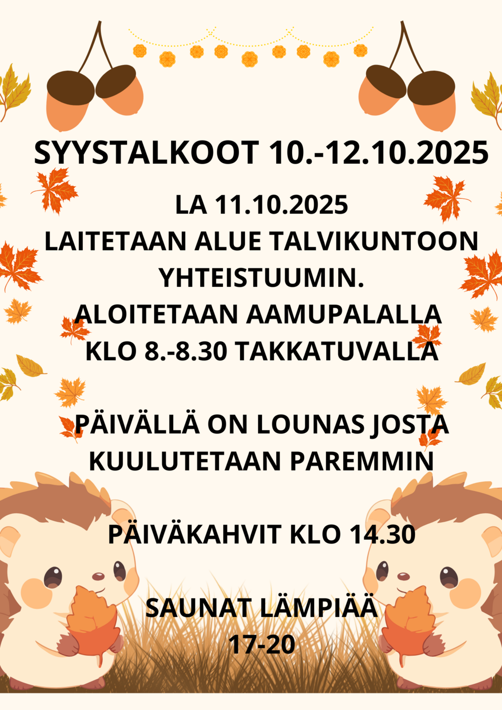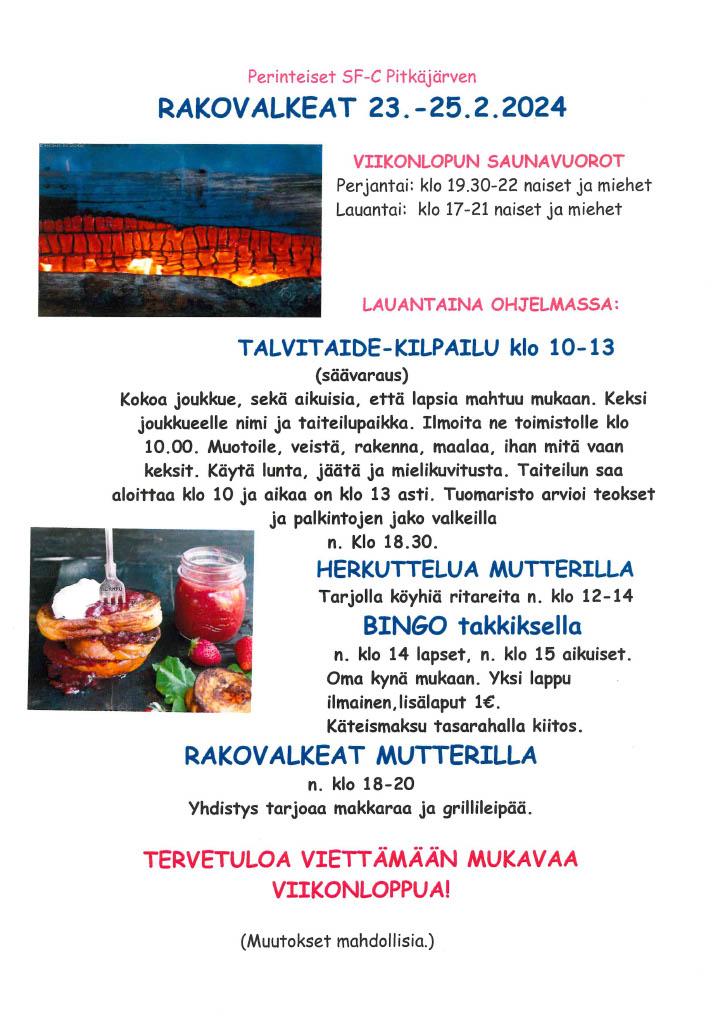 ALUSTAVA TAPAHTUMAKALENTERI 2024 23.-25.2. pe su RAKOVALKEAT 29.3.-1.4. to ma PÄÄSIÄINEN 24.3. su ISÄNTÄLISTA SOITTOKIERROS 26.-28.4. pe su KEVÄTTALKOOT 28.4.su KEVÄTKOKOUS 10-12.5. pe-su SF-CARAVAN…