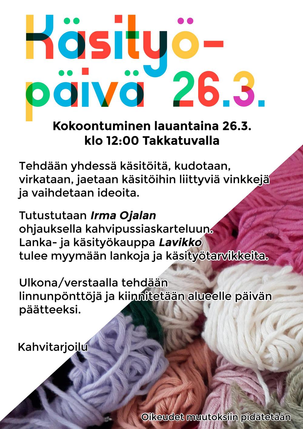 Tutustutaan Irma Ojalan ohjauksella kahvipussiaskarteluun. Lanka- ja käsityökauppa Lavikko tulee myymään lankoja ja käsityötarvikkeita.